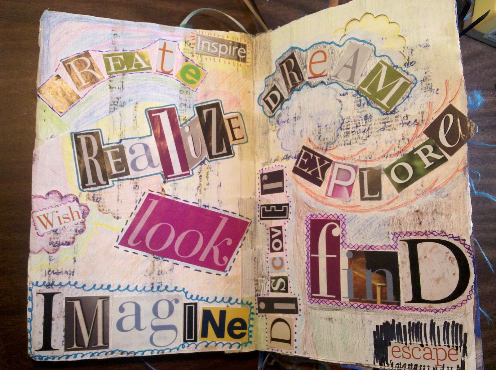 And here are some of my favorite pages. I am quite fond of painting/crafting over words. It is hard to see, but there are a few pages where I journal about my day/feelings/dreams/etc as a background. I have also taken pages from other books, written over them, and glued them into the journal for an added text filled background. It might seem a little counter productive to paint over something you've written, but it is very therapeutic to have the freedom to write whatever you want, knowing that no one will ever be able to read it. Now enough rambling and on to the pages: